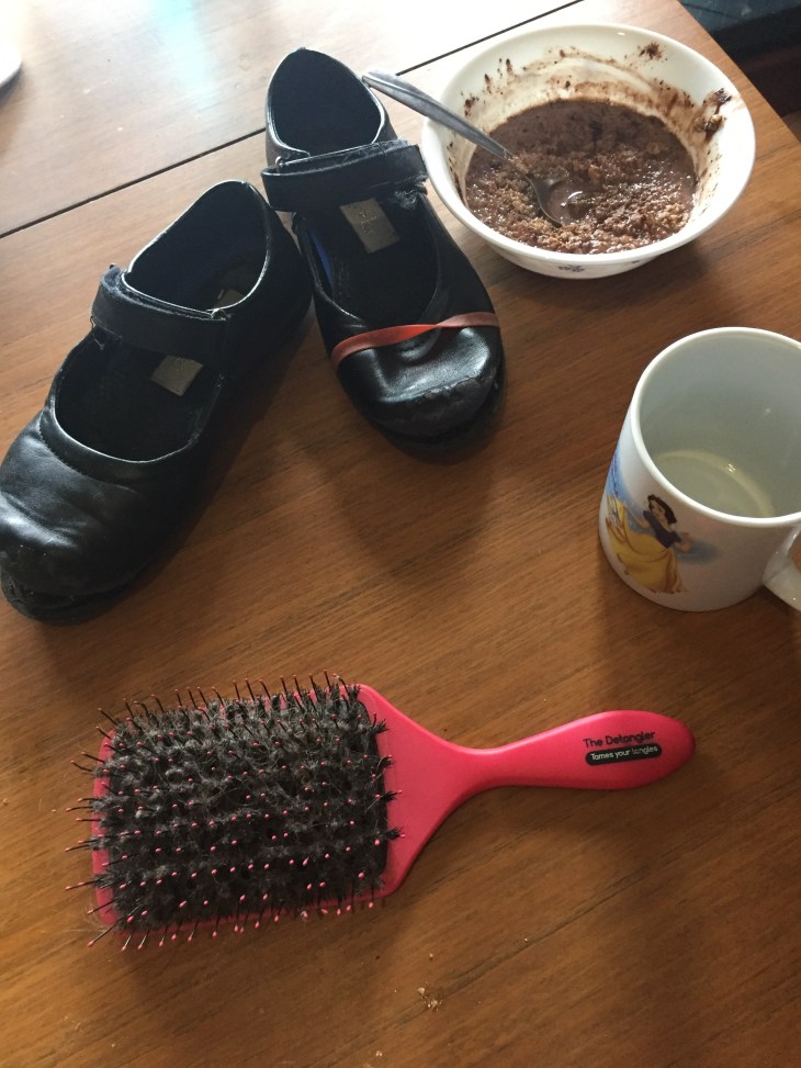 Mr E stumbles out of his room muttering Boy, I have a noisy neighbour and comes into the kitchen where he finds me with an ice brick in my hands, taking deep breaths. I explain to him that I am holding the ice brick to reset my brain, to help me calm down. It is a trick I learned in counselling. The sudden shock of cold disrupts the stress hormones. Mr E is a deep feeler like me, I want to be real with him about how our bodies react to our strong emotions. After a few minutes I check on Miss A, she is complaining of a sore stomach. I explain that it probably hurts from crying and screaming so much, then remind her that she needs to get dressed for school. She’s not going to school, she adamantly claims. A little while later, she comes into the dining room, dressed, with a flushed face and whimpering. I pull her onto my lap and brush her hair, then scratch her back and offer to make her a cup of tea. She accepts. I make it weak, milky and sweet. She sips at the tea and I keep cuddling her. I apologise for stepping on her toes. It was an accident. They were my favourite shoes, I loved them more than any other shoes in the whole wide world. You have loved lots of shoes, I reply. The other children enjoyed the bowls of hot chocolate flavoured porridge I had made for them, I offer to make her a bowl. She says no, she doesn’t like porridge. I offer to make her fruit toast, which I know she likes lathered in butter. No, she wants chocolate porridge. She won’t finish it, but I decide to let that battle go today, and I don’t allow the issue of tying up her hair to enter the arena either. She has calmed down now, and distracts herself fiddling with my phone.